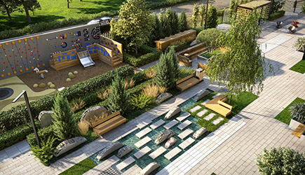 В благоустроенном дворе для жителей дома будет представлено разделение по интересам. Детям понравится игровая площадка с развивающими элементами, а взрослые могут отдохнуть в зоне для настольных игр и коворкинга, в зоне с динамичными элементами или же у фонтана.