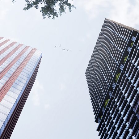Стильные башни ЖК Eniteo спроектированы специалистами архитектурных бюро HAAST и KAMEN architects. Это модные и эргономичные здания, которые лучше всего впишутся в современный облик мегаполиса. Особенно хорошо смотрится сочетание металла латунных оттенков и качественного стекла.