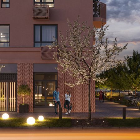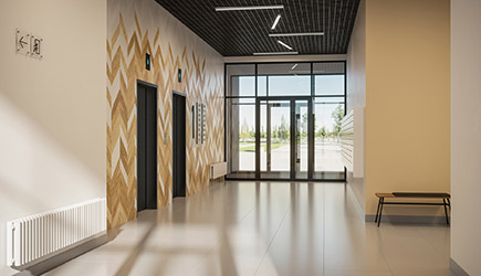 Сквозные входные группы проекта — безбарьерная среда с доступами в холлы на уровне земли. В дома будет легко завезти коляску или занести мебель. У входа есть колясочные и места для хранения велосипедов.