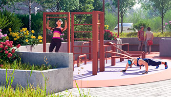 Внутренний двор ЖК «Грани» станет приватным местом для расслабления и занятия спортом. Здесь есть удобные площадки с уличными тренажерами, игровые городки для детей всех возрастов и шикарные островки зелени для непринуждённого отдыха и прогулок.