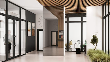 Все общие помещения ЖК «Грани» выполнены в лаконичном стиле с использованием экологически чистых материалов. На первом этаже появится колясочная, зона ожидания с мебелью, стойка ресепшн, банкоматы и боксы для приема посылок.