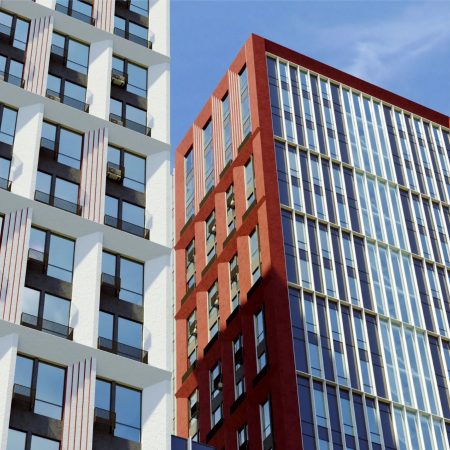 Архитектура ЖК HighWay многогранна и насыщенна – все черты комплекса, четкость линий и контрастность цветов призваны подчеркнуть яркую концепцию для жизни и бизнеса. Апарт-комплекс отличается закрытым внутренним двором с доступом контроля, так что на территорию не проникнут посторонние.