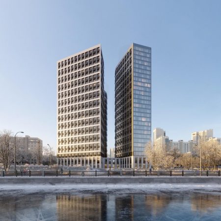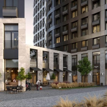 Проект предполагает 39 торговых помещений, включая собственный супермаркет и разнообразие других магазинов и сервисов. В проекте предусмотрена уникальная концепция благоустройства – современный двухуровневый двор с тихой и приватной зоной с панорамными видами на Москву-реку на крыше стилобата, детскими площадками, зоной для воркаута и целым полем для игры в волейбол. Из окон квартиры двор будет выглядеть как картина в стиле современной художницы Лизы Хохштейн.