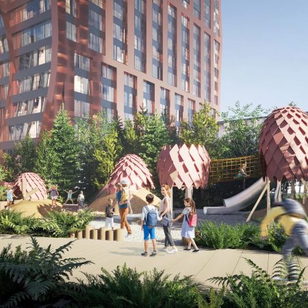 Здесь есть несколько детских площадок, например, лабиринт в форме осьминога и домики из шишек. Для взрослых предусмотрены террасы коливинга с живой изгородью, шезлонгами, столами и розетками. В самом центре двора расположен амфитеатр.