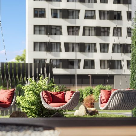 Закрытый внутренний двор ЖК «Рихард» благоустроен по всем современным стандартам. Здесь обустроена игровая площадка для детей любых возрастов, а также ландшафтный парк, сенсорный сад и площадка коворкинга. Здесь Вы почувствуете себя в полной безопасности: территория рядом с домом находится под охраной, а посторонние не смогут проникнуть внутрь.