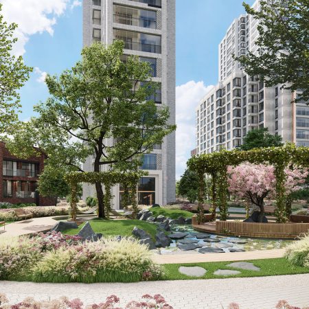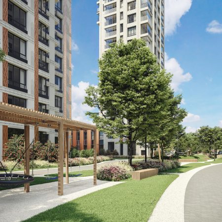 Территория ЖК RiverSky максимально гармонично впишется в природное окружение. Рядом с домами высадят взрослые деревья и кустарники, построят детский городок с оригинальными активностями и спортивную площадку. Также здесь появится сад, объединяющий элементы природы: воду, камень и растения.
