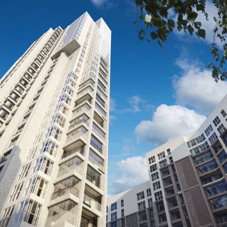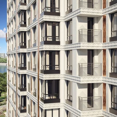 ЖК RiverSky отличается качественными фасадами, выполненными из экологически чистых материалов. Уникальная 3D кладка кирпича разных цветов и фактур формирует неповторимый архитектурный облик жилого квартала. Такой подход делает здание еще более объемным и текстурным. Дополнительно работает на сложносочиненную архитектурную композицию применение пластичного, фактурного и цветового разнообразия материалов. Здесь представлены как высотные башни, корпуса секционного типа, так и малоэтажная застройка – пристроенные двухэтажные таунхаусы.