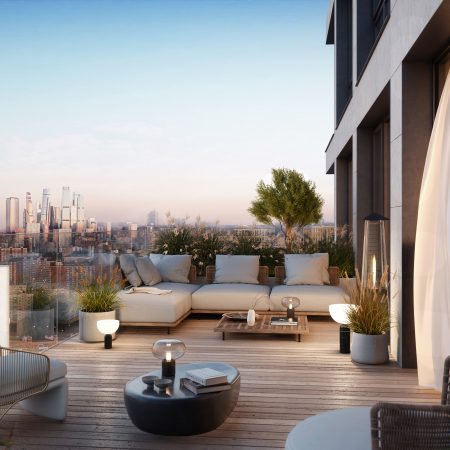 В проекте предлагаются квартиры без отделки, что позволяет организовать пространство по своему вкусу. Также доступны варианты с балконами и террасами, а на верхних этажах расположены пентхаусы.