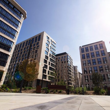 Выходите на станции метро Динамо и двигайтесь в сторону нового жилого квартала через парк рядом с ареной ВТБ.