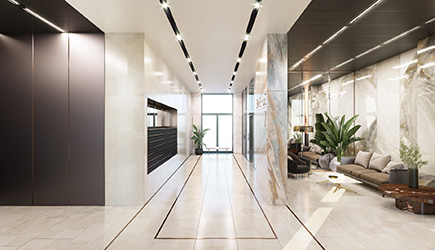 Дизайн лобби разрабатывало архитектурное бюро Gren. Он развивает тему, заложенную в общей концепции проекта и вдохновлен красотой ручьев и рек.